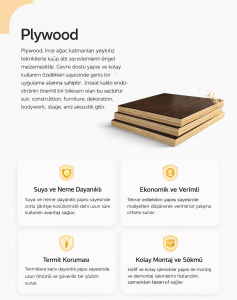 Plywood, ince ağaç katmanlarının özel tekniklerle bir araya getirilmesiyle üretilen, hafif olmasına rağmen yüksek dayanım sunan ahşap levha malzemesidir. Çevre dostu yapısı ve kolay kullanım özellikleri sayesinde geniş bir uygulama alanına sahiptir. Yüzeylerinde bulunan fenol film kaplaması, malzemeye ekstra dayanıklılık ve uzun ömür kazandırır.